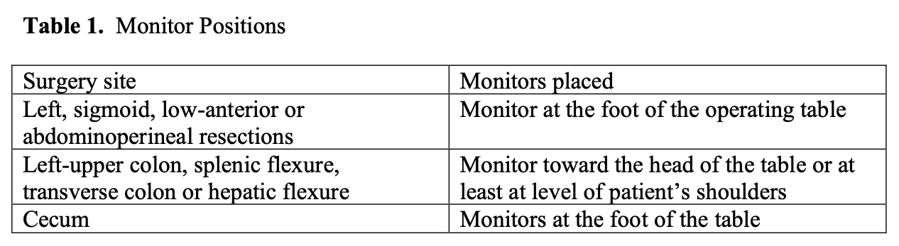Equipment required for laparoscopic surgery starts with the same basic equipment as that required for laparoscopic cholecystectomy or any advanced laparoscopic procedure. Two monitors placed in accordance with the portion of the colon on which the operation is planned have been found to be extremely helpful (Table 1).