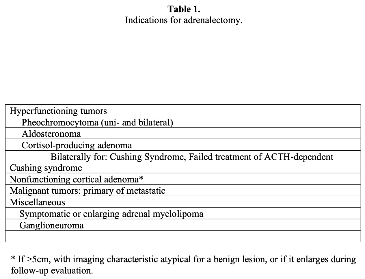 Adrenalectomy is indicated for unilateral and bilateral diseases that include hypersecretory adrenal tumors and all suspected adrenal malignancies, as illustrated in Table 1.