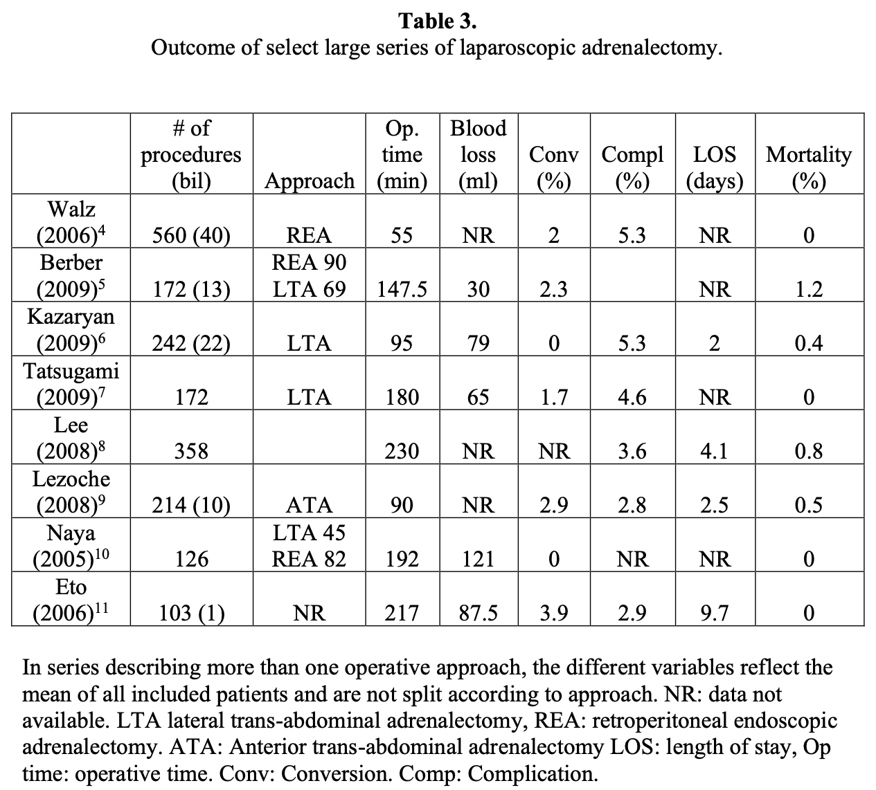 - Berber E, Tellioglu G, Harvey A, Mitchell J, Milas M, Siperstein A. Comparison of laparoscopic transabdominal lateral versus posterior retroperitoneal adrenalectomy. Surgery. 2009 Oct;146(4):621-5; discussion 625-626.