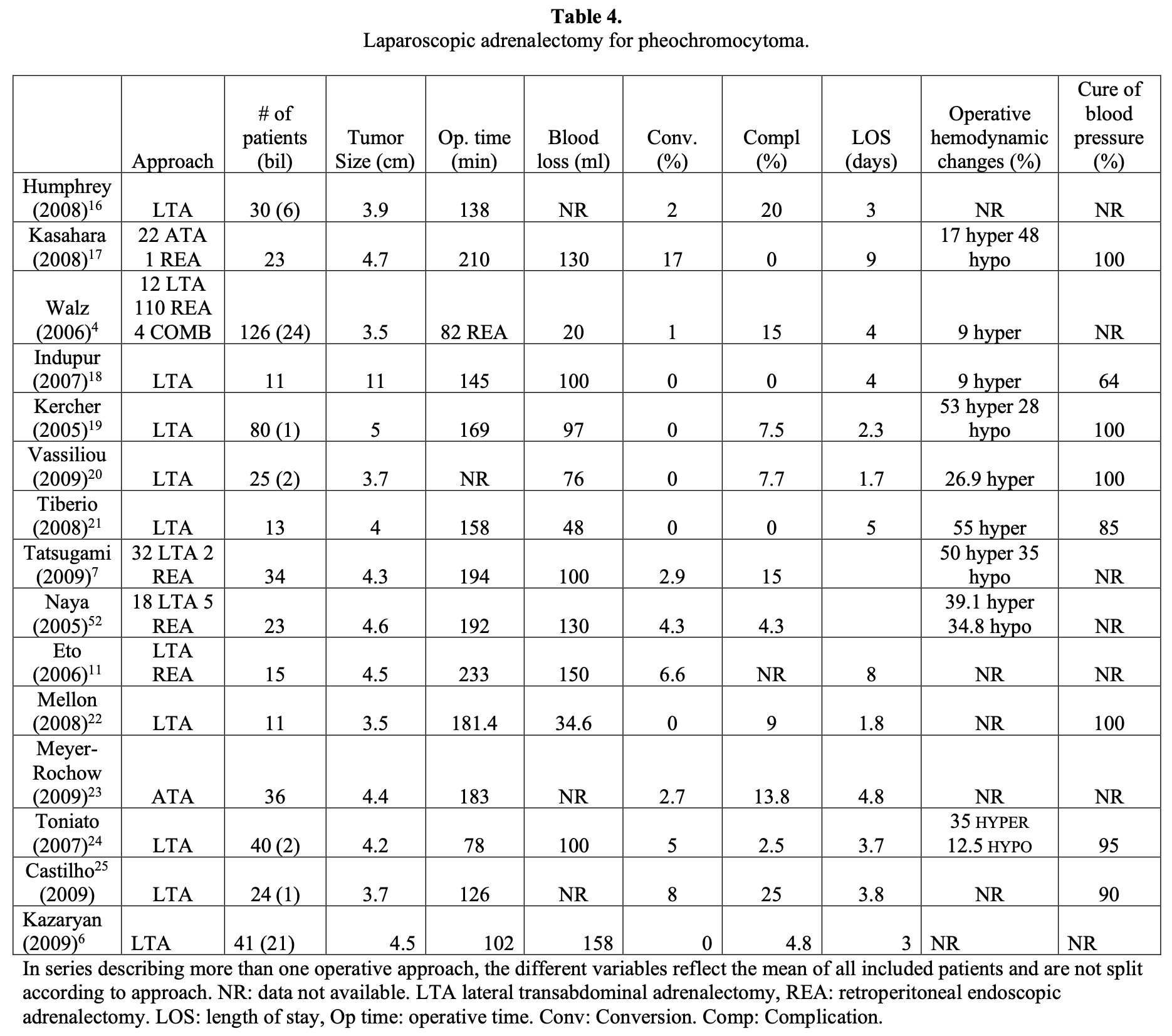 Fifteen articles reporting laparoscopic adrenalectomy for pheochromocytoma were found in the literature with 532 patients undergoing 565 adrenalectomies. Pheochromocytoma is a tumor that can grow up to 15cm in size. Many authors prefer to approach the disease from the peritoneum. In the literature collected, LTA was reported to have been used 3 times more than REA. The only author preferring REA was Walz4 who demonstrated an operative time of 82 minutes, half of the average time for the other series. The author describes how the use of high gas pressure up to 24mm Hg and the absence of abdominal organs that must be pulled apart make this operation easy and feasible even for a large tumor.