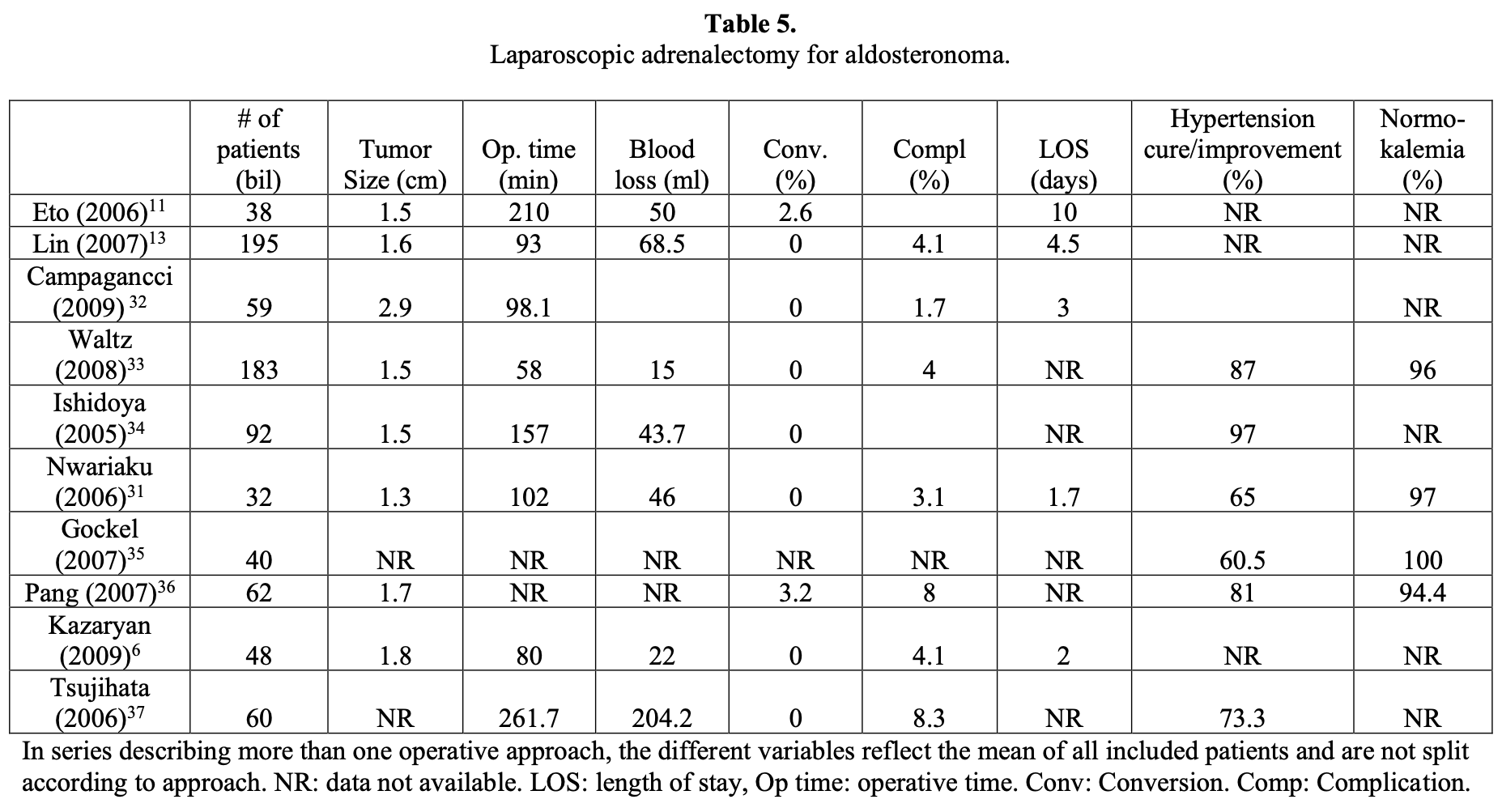 We reviewed 10 articles in which 809 adrenalectomies were described. The average tumor size was 1.7cm, which is more than half the size of the average pheochromocytoma; this could be the reason for the shorter adrenalectomy operative time for aldosteronoma compared with operative time for pheochromocytoma, 132.4 minutes versus 162.2 minutes, respectively. Blood loss was 64.2mL, and conversion rate was 0.6%. As previously mentioned, the slim body habitus of a patient in conjunction with the small size of the tumor makes the surgery easier to perform. Twenty-nine complications were described (0.3%), and even for the aldosteronoma the more described complication was bleeding, which was 31% of all the complications. The other complications described were approach related, such as chronic lumbar pain, retroperitoneal hematoma and lumbar fossa hematoma, colonic fistula, wound infection, or general, such as fever, pneumonia, urine infection, cardiac ischemic event, and ECG changes related to hypokalemia. This last one happened in only 1 patient, while normokalemia was described in 96.8% of the patients at the follow-up. Hypertension cure or improvement was reported in 77.3% of the patients (Table 5).6,11,13,31-37