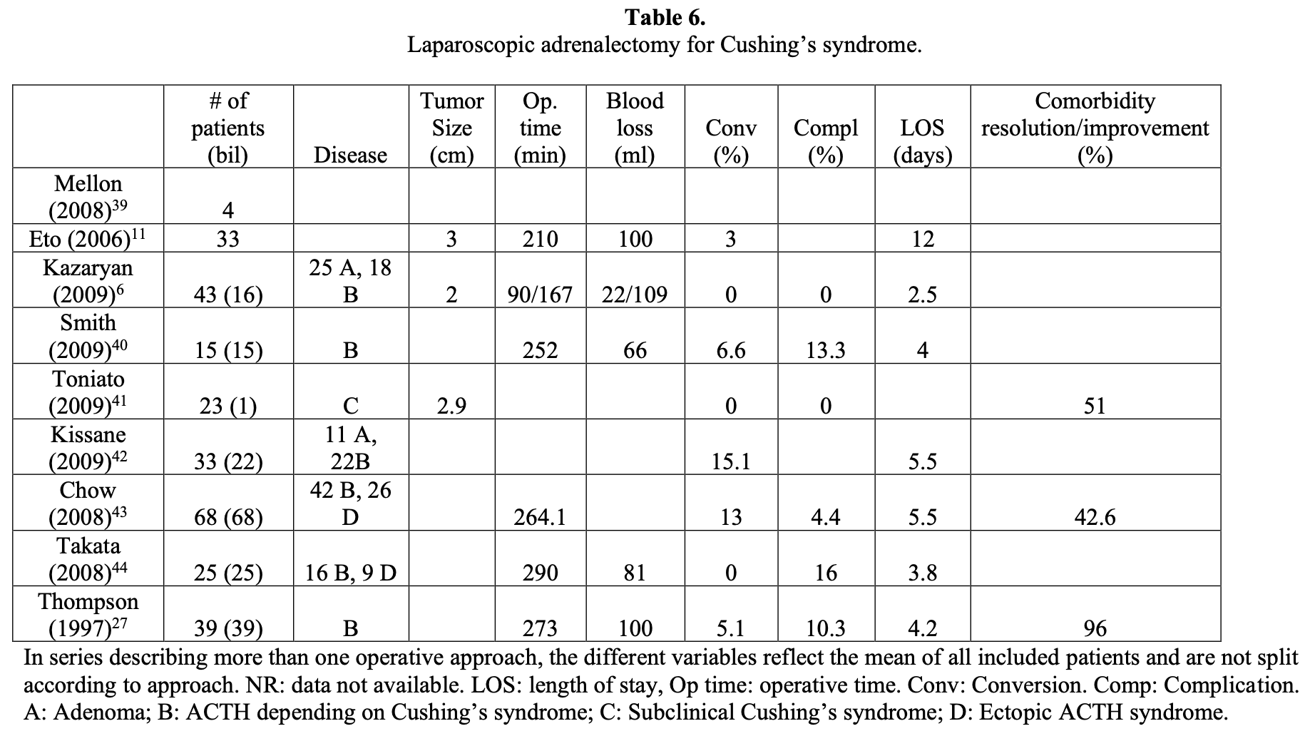 We have collected reports of 8 series from the literature of the last 5 years about laparoscopic adrenalectomy for Cushing’s syndrome. The comparison between these series and those for pheochromocytoma and aldosteronoma is more difficult, because of the high rate of bilateral disease in Cushing’s patients. Of 279 patients operated on, 186 underwent a bilateral adrenalectomy. This also accounts for the higher operative time. While the operative time for pheochromocytoma and aldosteronoma was respectively 162 minutes and 132 minutes, for Cushing’s syndrome, it was 242 minutes. The blood loss was an average of 91mL, which is comparable to that with other adrenalectomies, while conversion was reported to be higher and consequently the length of hospital stay was 5.3% and 5.3%.