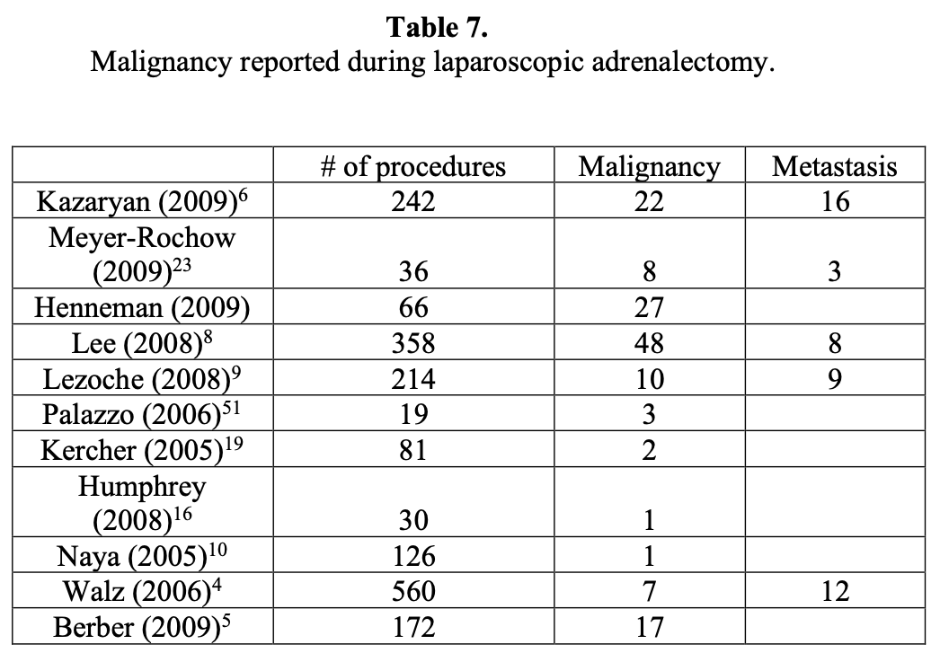 Also adrenal glands are relatively common sites for metastatic disease, being in many cases a manifestation of a more systemic process.46,47 We found 11 articles on malignant adrenal tumor (Table 7).4-6,8-10,16,19,23,51 The authors do not specifically describe the characteristics of the malignancy and the eventual different approach used by the surgeon. For this reason, it is more difficult for us to describe and compare these with the other lesions. Of 1904 adrenalectomies, only 8.1% of tumors were malignant, and of these 30% were metastatic disease. Moreover, many of the diagnoses were established based on the final histological report, and no more action was taken. In the articles48,49 in which adrenalectomy for malignancy was specifically described, no difference was found in operative time, complications, and morbidities between adrenalectomy for malignant or benign tumors.