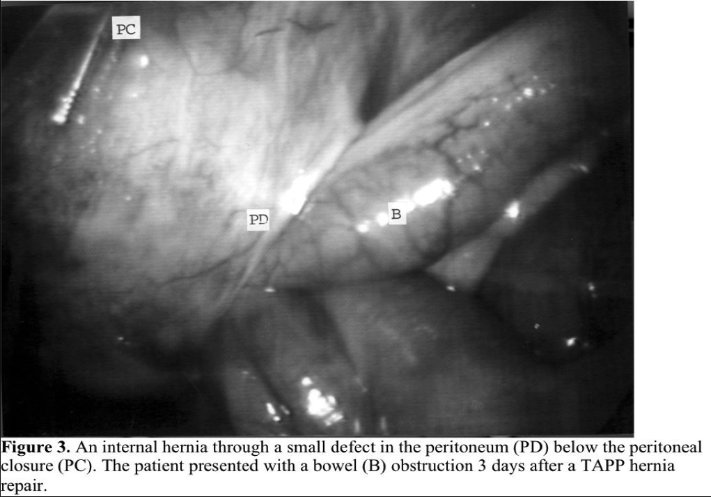 Small-bowel obstruction after a laparoscopic hernia repair can occur. It is the result of adhesions to inadequately covered mesh or due to intestines being entrapped in a defect left in the peritoneum. Exposed mesh with either the TAPP or the totally extraperitoneal hernia repair (TEP) is rare, if the surgeon mobilizes the peritoneum to fully cover the mesh. Adhesions to spiral tacks used to close the peritoneum during TAPP repairs do occur, but can be avoided by suturing the peritoneal defect instead of tacking it. If the peritoneum is inadequately closed after a TAPP repair, an internal hernia can occur in the defect in the peritoneum.17 Whether staples or sutures are used to close the peritoneum, gaps cannot be left in the peritoneal closure. If a defect in the peritoneum is left after a TEP repair, rarely the bowel can become incarcerated (Figure 3).18 A potential space is created between the peritoneum and the abdominal wall by the dissection of the posterior floor and by the CO2 gas. Bowel may become obstructed at the entrance to this space.