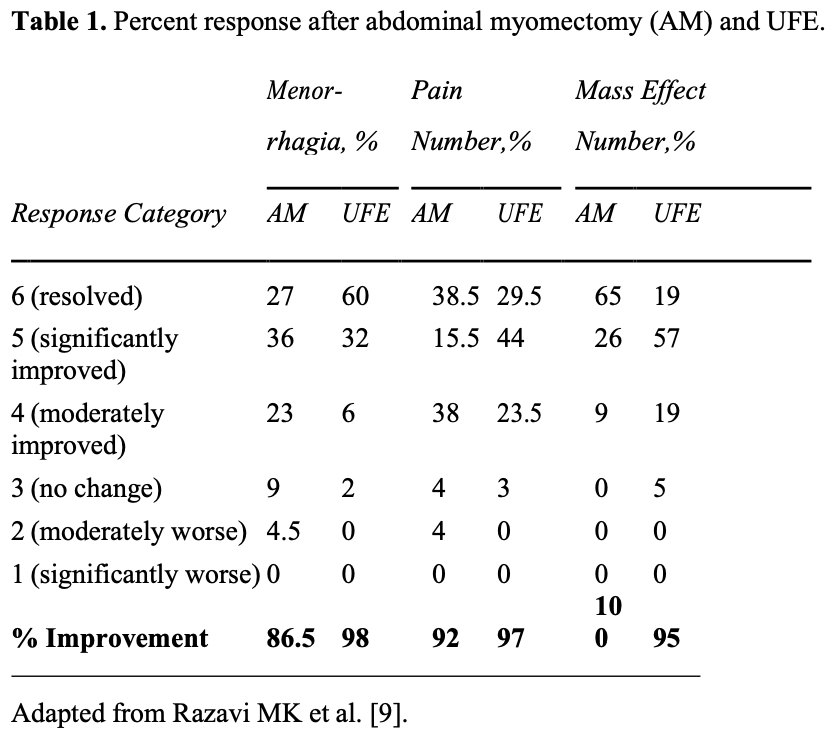 - Razavi MK, Hwang G, Jahed A, Modanloo S, Chen B. Abdominal myomectomy versus uterine fibroid embolization in the treatment of symptomatic uterine AJR Am J Roentgenol. 2003;180(6):1571-1575.