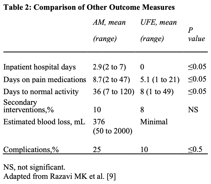 Comparison of other outcome measures, such as postprocedural pain, recovery period, and complications, all favored UFE (Table 2). The need for secondary interventions during the study period was similar in both groups.