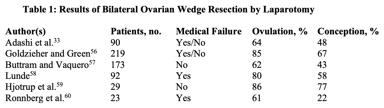 - Adashi EY, Bock JA, Guzick D, et al. Fertility following bilateral ovarian wedge resection:a critical analysis of 90 consecutive cases of the polycystic ovary syndrome. Fertil Steril. 1981;36:320.