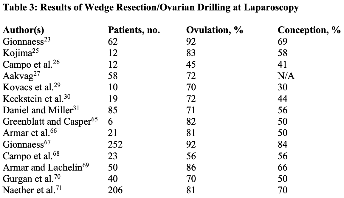 - Weinstein D, Polishuk WZ. The role of wedge resection of the ovary as a cause for mechanical sterility. Surg Gynecol Obstet. 1975;141:417.
