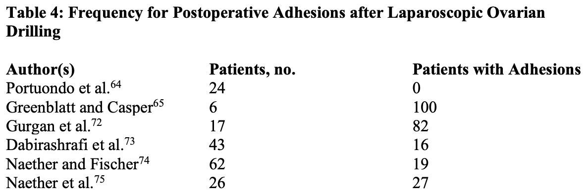 - Naether OG, Fischer R. Adhesion formation after laparoscopic electrocoagulation fo the ovarian surface in polycystic ovary patients. Fertil Steril. 1993;60:95.