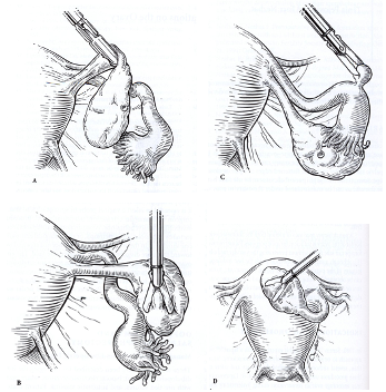 Removal of the ovary may be difficult if it is more than 5 cm in diameter. It can be removed through a 10-mm trocar sleeve placed in a suprapubic punctures, pulling the sleeve and forceps together and bringing the tissue to the incision. A Kelly or Kocher clamp is used to grasp the tissue to remove it from the abdomen. Alternatively, a long clamp is inserted through the accessory trocar incision and the tissue is grasped under direct observation and pulled from the abdomen through the trocar incision. The tube and ovary can be divided wit scissors, a morcellator, or a laser and removed through trocar sleeves if fragmentation is not contraindicated by the characteristics of the cyst. If an open laparoscopy is required, the ovary is removed through an enlarged umbilical incision. After the ovary is removed, the pelvic cavity is irrigated and the pelvis is examined to assure hemostasis. For endometriomas and there cysts 5 cm or larger, the tissue is removed by posterior colpotomy. The cul-de-sac is identified by placing a sponge stick in the vagina and applying pressure to the posterior fornix between the uterosacral ligaments. An incision is made between the uterosacral ligaments with a laser or unipolar knife electrode. Once the incision extends to the sponge stick, the ovary is brought to the incision and grasped vaginally with an allis clamp. If a cyst is present, it is deflated with a large-bore needle or trocar while traction is applied to the ovary. As the ovary collapses, it is pulled into the vagina intact, with minimal spillage of its contents. The colpotomy is closed vaginally or laparoscopically, using two to three sutures.