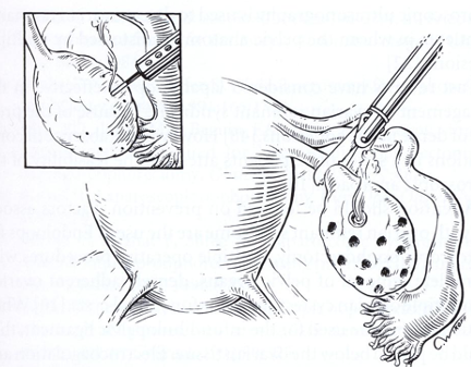 Figure 10. Ovarian drilling is used for PCOD. While the ovarian ligament is grasped and the ovary is held, multiple surface craters are created by the CO2 laser, fiber laser, or needle electrode (inset).
