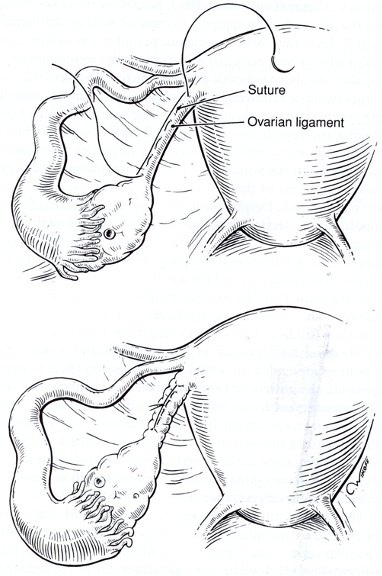 Figure 11. Ovarian suspension is achieved with a monofilament suture placed along the length of the utero-ovarian ligament and tied.