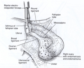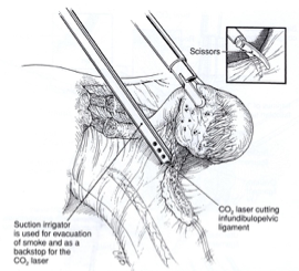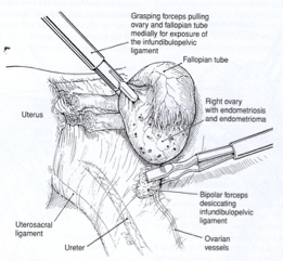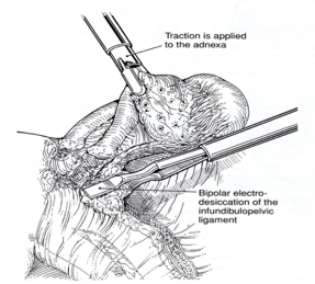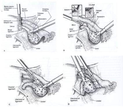 The ovary may be enlarged, may be adherent to the pelvic side wall and broad ligament, or may contain endometriomas, so the surgeon may need to enter the retroperitoneal space. In this case, the ovary is removed by retro peritoneal dissection. After hydrodissection is done, an incision is made between the round and Infundibulopelvic ligaments medial to the pelvic side wall. Blunt dissection, hydro dissection, and sharp dissection with the CO2 laser are used to lyse adhesions and separate the adnexa and peritoneum, ureter, and blood vessels. Hemostasis is achieved with bipolar forceps. After dissection of the pelvic side wall, the remaining infundibulopelvic ligament, the ovarian ligament, and the proximal portion of the tube are coagulated and cut. The ureter is dissected from the ovary, and the adnexa are removed.
