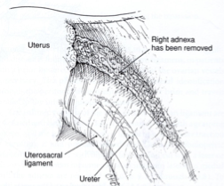 An ovary and tube minimally involved with adhesions or endometriosis are approached from the infundibulopelvic ligament or the utero-ovarian ligament. Filmy adhesions that limit the mobility of the ovary are lysed. Ovarian cysts are aspirated and deflated, making removal of the ovary easier. The adnexa are removed by beginning with the infundibulopelvic ligament. This approach is preferable if the uterus is to be removed or significant disease is found in the uterine-ovarian ligament, in patients with a prior hysterectomy, or if hemostasis of the ovarian vessels is necessary. The procedure begins with ureteral identification through the peritoneum as it enters the pelvic brim and travels parallel to the infundibulopelvic ligament.