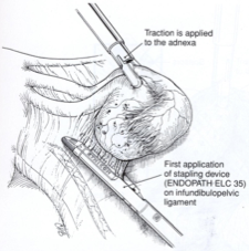 Figure 9. A right salpingo-oophorectomy is done using a stapling device. The tube and ovary are under traction as the Endopath ELC 35 is applied across the infundibulopelvic ligament.