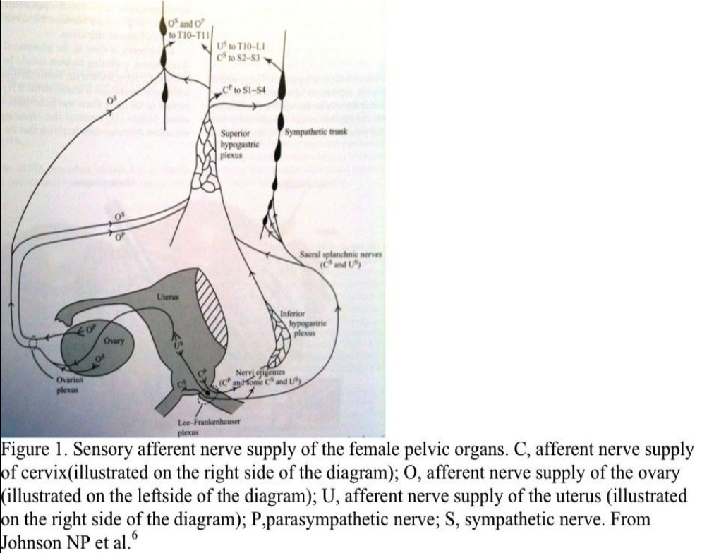 From the uterosacral ligaments, the parasympathetic afferent nerves reach the dorsal root ganglia of S1-S4 via the pelvic splanchnic nerves (nervi erigentes) and inferior hypogastric nerve plexus (also known as the pelvic plexus), and then the superior hypogastric nerve plexus (also known as the presacral nerve or hypogastric plexus).12 The sympathetic afferent nerves emerging from the Lee–Frankenhauser plexus accompany the uterine, iliac, and inferior mesenteric arteries to the sacral sympathetic trunk via the sacral splanchnic nerves, some of which bypass the superior hypogastric nerve plexus.
