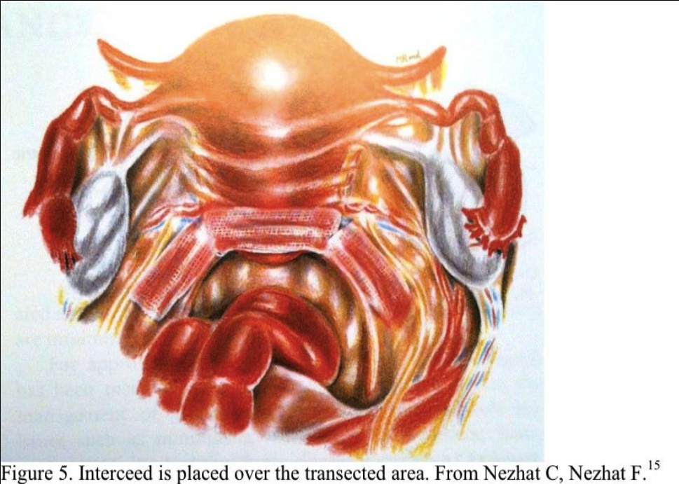 Following the recommendation of Fujii, the tissue located approximately 1 to 3 cm along the uterosacral ligament should be treated to a depth of 1.5 cm.14 This segment of the uterosacral ligament is close to the uterine vessels and ureter. The suction– irrigator serves as a backstop to make the uterosacral ligament more prominent and protect the ureter. A relaxing incision may be made along the outer side of the ligament to retract the ureter laterally before the ligament is transected (Figure 3). The blood vessels run along the medial aspect of the uterosacral ligament, and bleeding in this area must be controlled carefully because of the proximity of the ureter and rectum. Some gynecologists also vaporize a path along the base of the cervix between the uterosacral ligaments (Figure 4). Interceed (Gynecare) may be placed over the transected area (Figure 5).