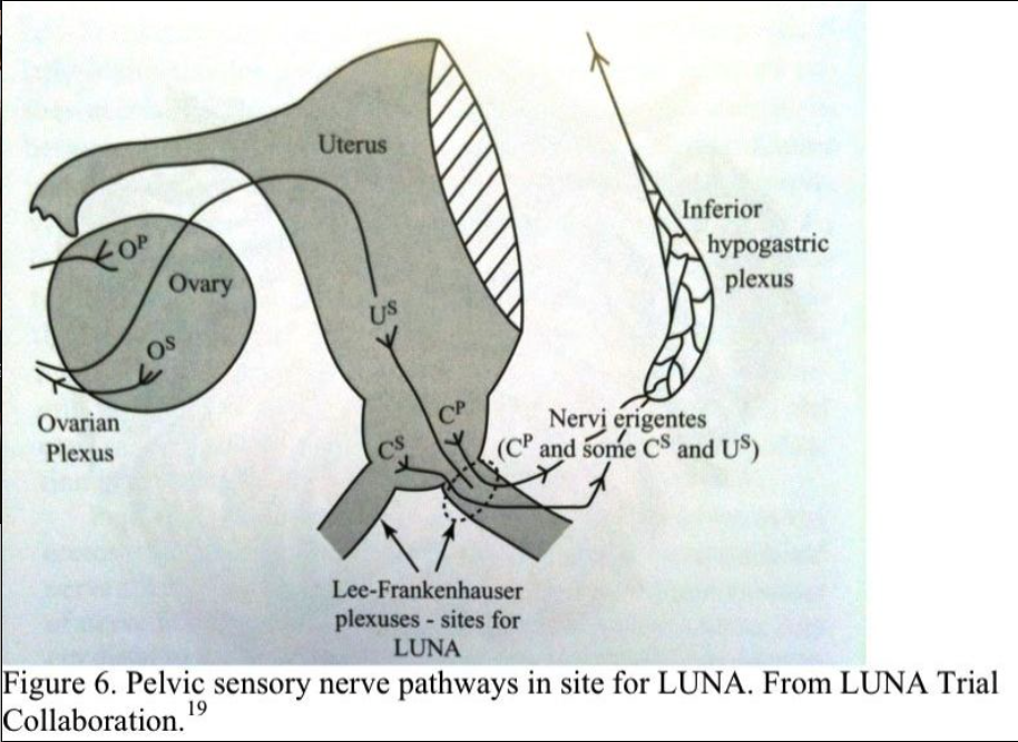 University of Birmingham, in a randomized controlled trial in 2009 found that Among women with chronic pelvic pain, LUNA did not result in improvements in pain, dysmenorrhea, dyspareunia, or quality of life compared with laparoscopy without pelvic denervation.25