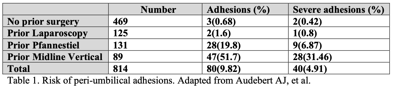 Even more important for laparoscopic surgery is the presence of peri-umbilical adhesions. In most cases, the umbilicus remains the primary site of entry for a variety of laparoscopic procedures. Table 1 demonstrates the incidence of peri-umbilical adhesions following various surgical interventions.
