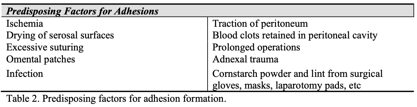 When the fibrinolytic activity of the peritoneum is suppressed, fibrinous adhesions are formed and persist, as collagen deposition and neovascularization occur. The factors that suppress fibrinolytic activity and promote formation of postoperative adhesions are listed in Table 2.