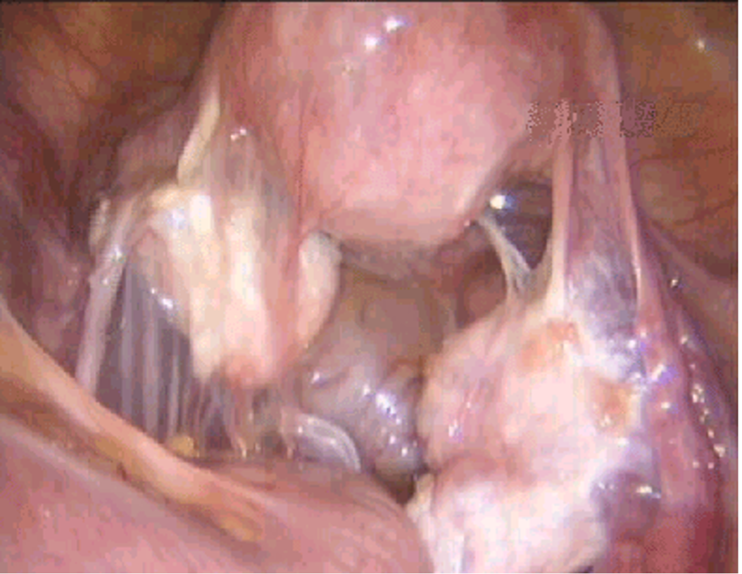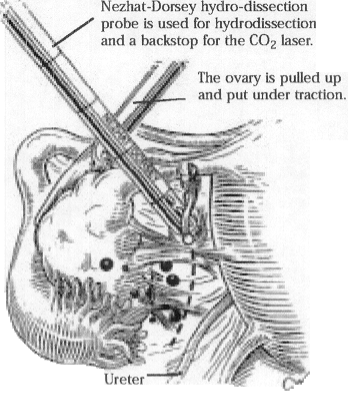 Bleeding areas are coagulated with the laser or a bipolar electrocoagulator. Whenever possible, either the adhesions or the ovarian ligaments are grasped instead of the ovarian cortex to reduce trauma. Once the ovaries are lifted from the cul-de-sac and mobilized, the peritubal adhesions are removed.