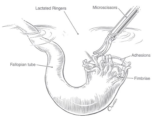 Agglutinated fimbrial folds are caused by fine avascular adhesions. As the fimbrial folds float and disperse in the fluid, the adhesions become visible; they are grasped, stretched, and sharply cut with fine scissors or an ultrapulse laser. The laser beam (other than ultrapulse) delivered through the laparoscope is at least 1 mm in diameter and is too wide for these narrow bands of adhesions. Thermal damage can occur with electrosurgery and the fiber laser (neodymium-yttrium aluminum garnet, potassium titanyl phosphate, or argon). When performing delicate microscopic procedures such as fimbriolysis and salpingo-ovariolysis, the microscissors or ultrapulse laser are preferable.