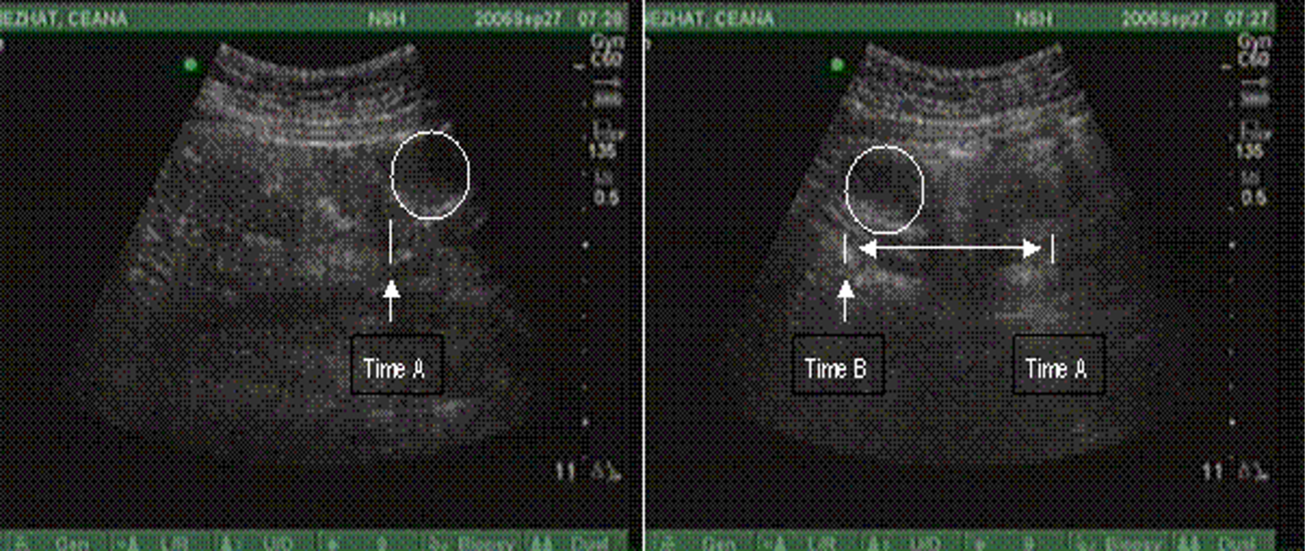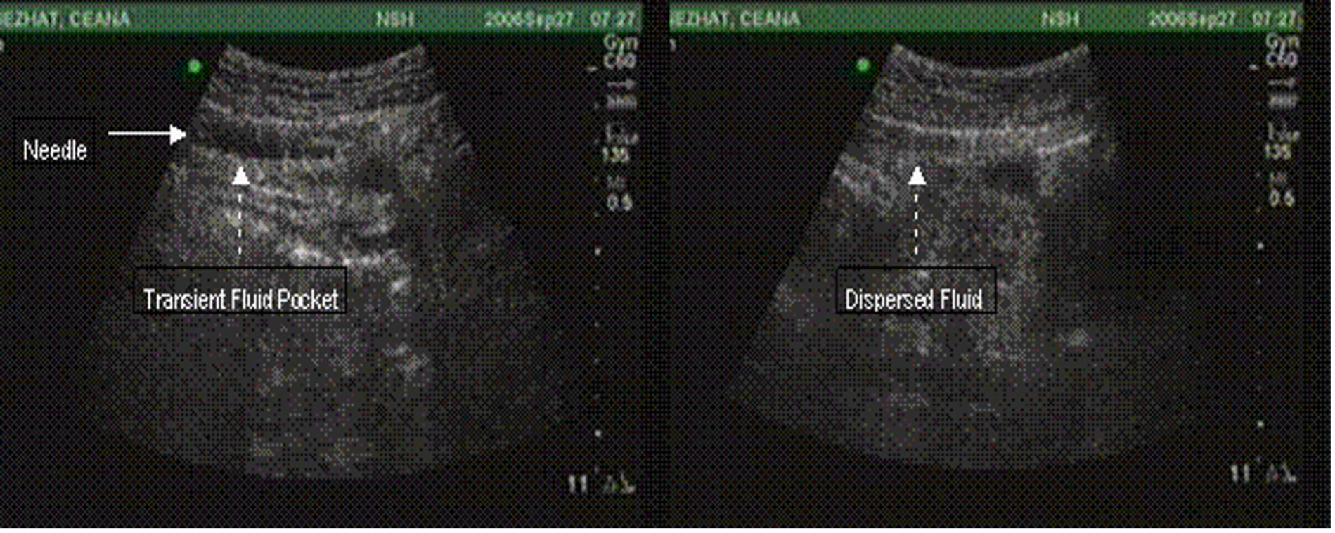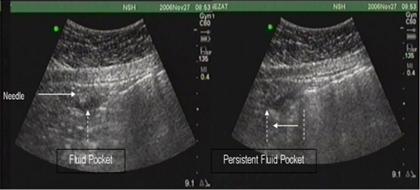 Figure 3. Normal PUGSI with observed dispersion of intaperitoneal “bubble” after injection of 10cc of sterile saline with 21 gauge needle.