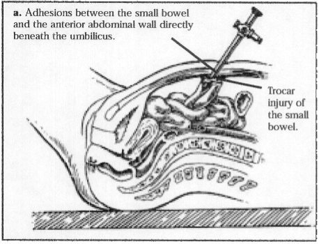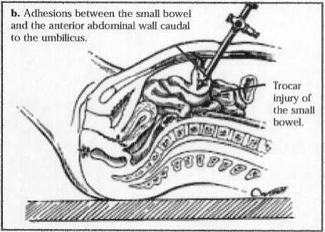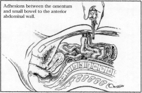 Intra-abdominal adhesions between the previous abdominal scar and the underlying viscera are a common consequence of laparotomy. Patients undergoing laparoscopy after a previous laparotomy should be considered at risk for the presence of adhesions between the old scar and the underlying viscous, such as bowel or omentum. It has been reported that after laparotomy, 68-82% of patients will have intra-abdominal adhesions. Patients with midline abdominal incisions had more adhesions (59%) than did those with Pfannenstiel incisions (27%). Patients with midline incisions done for gynecologic indications had more adhesions (42%) than did patients with any abdominal incisions performed for obstetric indications (22%). The type of incision did not affect the presence of adhesions in patients with previous obstetric operations. Adhesions to the bowel were more common after midline incisions above the umbilicus. Twenty-one women had direct injury to adherent omentum and bowel during the laparoscopicprocedure.