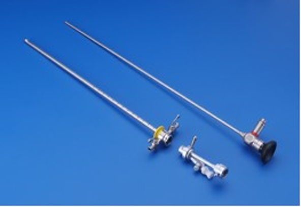 Cystoscope — A rigid cystoscope consists of a telescope, bridge connector, sheath, and obturator (fits inside the sheath).1 A 30 or 70 degree telescope is usually used for cystoscopy, whereas 0 degree lens is preferred for urethroscopy (Figure 14, Figure 15). The 0 and 12 degrees lenses focuses largely straight ahead and are excellent to evaluate the urethra, but often times are inadequate for visualization of the entire bladder.20,21