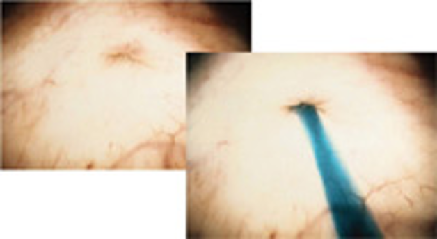 Ureteral orifices — the trigone is directly in front of the urethra and is identified by locating the interureteric ridge. The cystoscope may need to be rotated to visualize the ureteral orifices. Several minutes of observation may be needed to identify the orifices, which are small, slit-like openings that only become apparent when a burst of urine is released (Figure 16, Figure 17).
