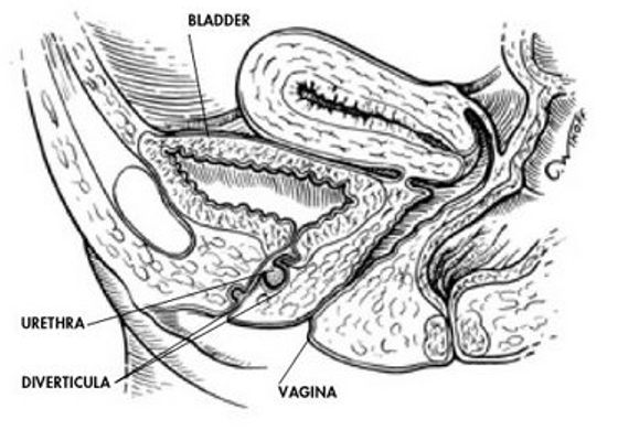 A diverticulum is a sac pouching out from a hollow organ. It is usually located posteriorly somewhere along the urethra. In females it is located in the space between the periurethral fascia and anterior vaginal wall (Figure 3). The prevalence of female urethral diverticula ranges from 1-5%.7,8 Diverticula occur most commonly in people aged 30-60 years. The mean age at diagnosis is 45 years. The exact etiology is not well understood. It can be congenital or acquired. In women it is commonly acquired.