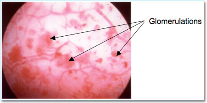 Cystoscopy, hydrodistension, bladder biopsy, and potassium sensitivity testing are not necessary for diagnosis of PBS/IC, however cystoscopy should be performed if there is high suspicion for other pathologies. During cystoscopy the bladder epithelium should be examined for characteristic findings of IC, which include glomerulations (petechial red areas) and reddened patches (Hunner’s patches). Biopsies are taken from any suspicious areas (Figure 4).